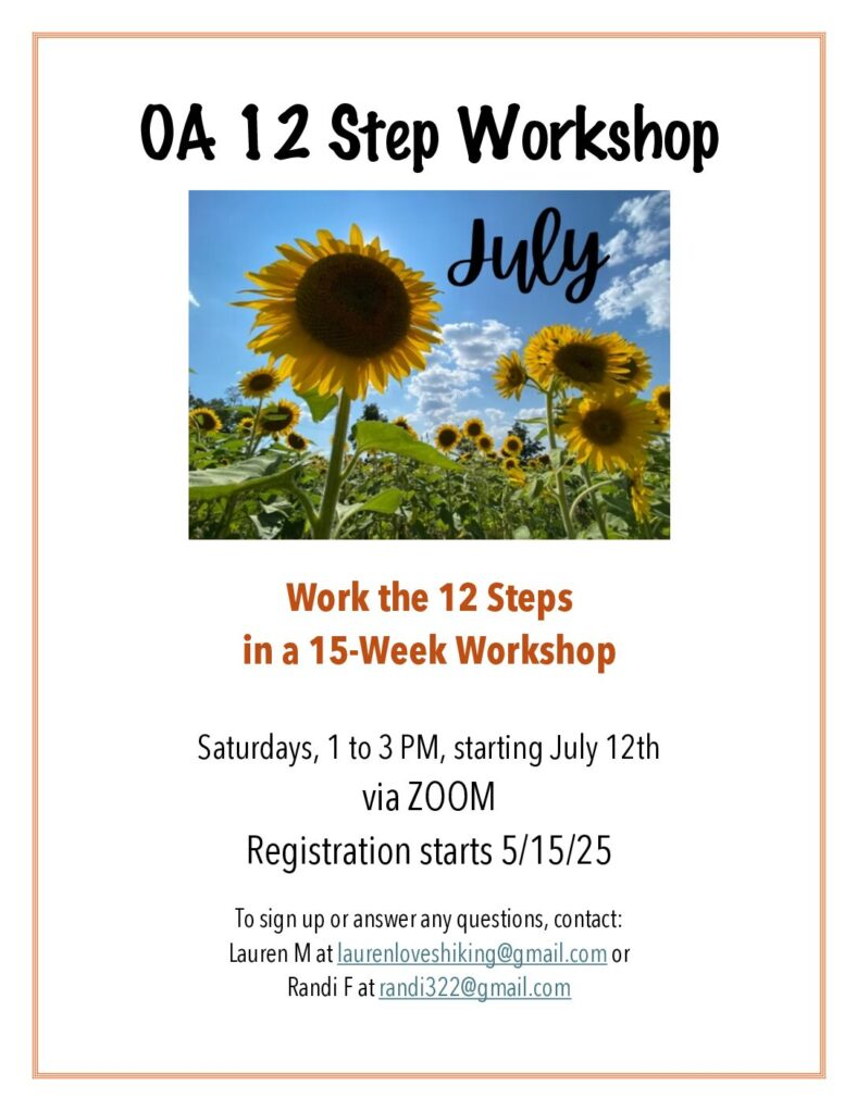 5. 12 STEPS IN 15 WEEKS. Registration for this virtual OA Workshop opens on May 15th. The series will run on Saturdays from 1 to 3
